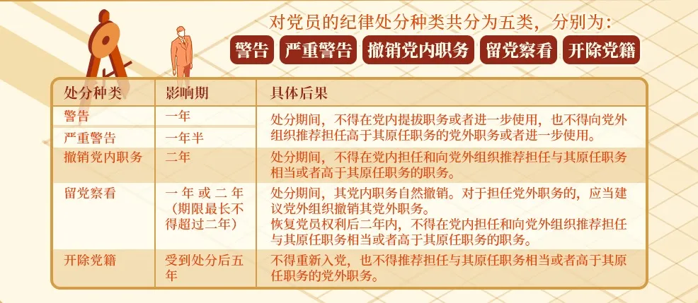 《中國(guó)共產(chǎn)黨紀(jì)律處分條例》規(guī)定,對(duì)黨員的紀(jì)律處分種類共分為五類,分別為警告、嚴(yán)重警告、撤銷黨內(nèi)職務(wù)、留黨察看和開除黨籍。