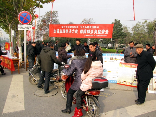 阜陽(yáng)市鹽務(wù)局高度重視此次宣傳活動(dòng),結(jié)合自身業(yè)務(wù)范疇,精心準(zhǔn)備大量法制宣傳資料。早晨7時(shí),天氣陰冷,寒風(fēng)勁吹,我局鹽政執(zhí)法人員在副局長(zhǎng)王道亞的帶領(lǐng)下,早早地布置好法制宣傳臺(tái)。在活動(dòng)現(xiàn)場(chǎng)王道亞親自向過(guò)往群眾宣傳鹽政法律法規(guī)知識(shí),宣傳消費(fèi)者、經(jīng)營(yíng)者的權(quán)利和義務(wù),宣傳消費(fèi)者如何依法維權(quán);進(jìn)行了假冒偽劣食鹽展示和鑒別;開(kāi)展了涉鹽咨詢、受理投訴舉報(bào)。此次宣傳共發(fā)放宣傳資料500余份,接受群眾咨詢200余人次?;顒?dòng)現(xiàn)場(chǎng)布置了咨詢展臺(tái),擺放宣傳圖板10塊、宣傳展架3個(gè)、懸掛 2條生動(dòng)主題橫幅,展示了近期查獲的部分劣質(zhì)私鹽樣品,教市民辨別真假碘鹽的活動(dòng),咨詢臺(tái)前觀看宣傳圖版和前來(lái)咨詢的群眾絡(luò)繹不絕,受到了親自趕赴現(xiàn)場(chǎng)慰問(wèn)的市人大常委副主任李新才、市政府副市長(zhǎng)黃珍、市政協(xié)副主席張永俠、市委宣傳部、市司法局和市依法治市領(lǐng)導(dǎo)小組辦公室有關(guān)領(lǐng)導(dǎo)以及廣大群眾的一致好評(píng)。