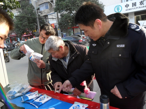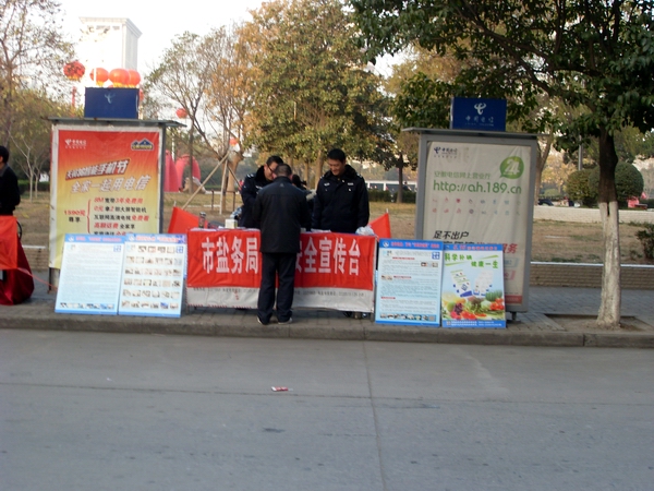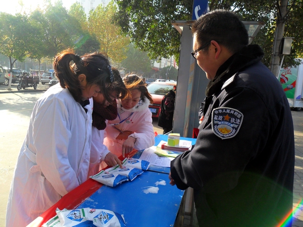 在本次活動中,阜陽市局設立宣傳咨詢臺,宣傳展架4個,擺放精心準備的宣傳資料和傳單,展示近期在市場查獲得各類假冒鹽品,現(xiàn)場接受市民咨詢散發(fā)宣傳單300余份,向群眾宣傳普及鹽業(yè)法規(guī),并推出了現(xiàn)場教市民辨別真假碘鹽的活動,咨詢臺前觀看宣傳圖版和前來咨詢的群眾絡繹不絕,廣大市民對國家為確保民生,食鹽專營的政策深表理解和支持。市領導對宣傳點進行慰問檢查時,對阜陽市的鹽政管理給予了充分肯定和認可,并鼓勵大家再接再厲再創(chuàng)佳績。