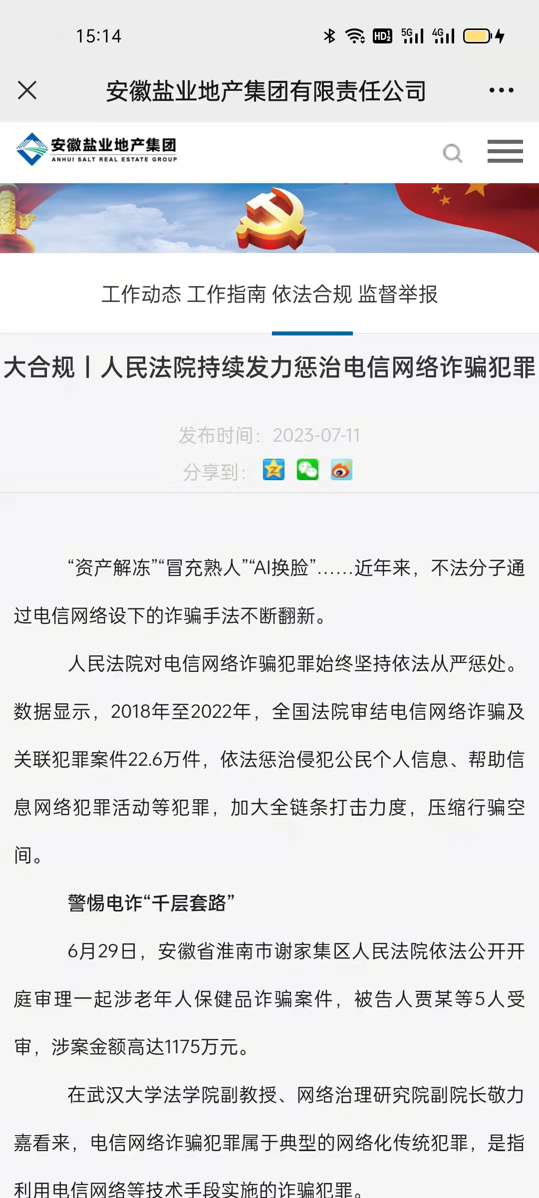 環(huán)境科技集團、省健康養(yǎng)老、徽鹽金融等公司通過印制各類反詐宣傳單、宣講防范電信詐騙安全知識,在公眾號發(fā)表普法文章等形式,號召全體員工增強防范意識。