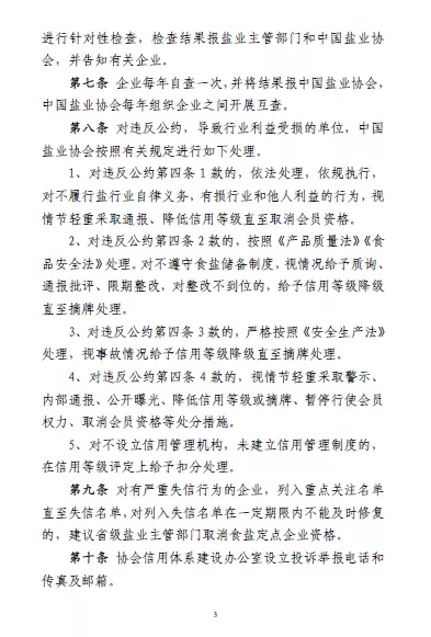 對違反公約第四條 1 款的(守法合規(guī)),依法處理,依規(guī)執(zhí)行,對不履行鹽行業(yè)自律義務(wù),有損行業(yè)和他人利益的行為,視情節(jié)輕重采取通報(bào)、降低信用等級直至取消會員資格。